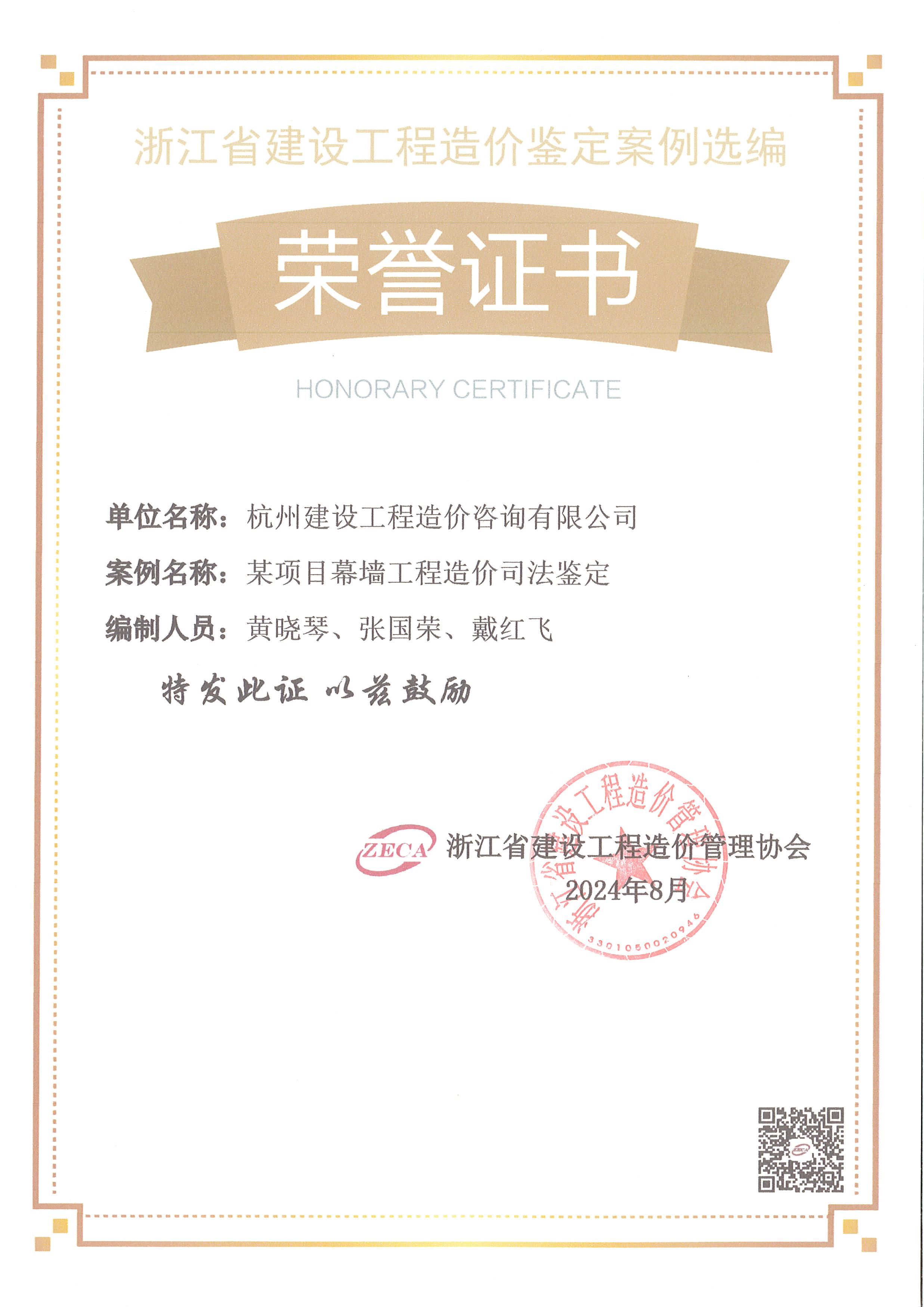 公司土建一部副经理黄晓琴申报的“某项目幕墙工程造价司法鉴定”的司法案例成功入选。该案例梳理了争议焦点、造价鉴定难点,提出的意见鉴定分析以及处理结果可借鉴性强,最终该鉴定案例成功进入浙江省建设工程造价鉴定案例选编(共计15篇)。